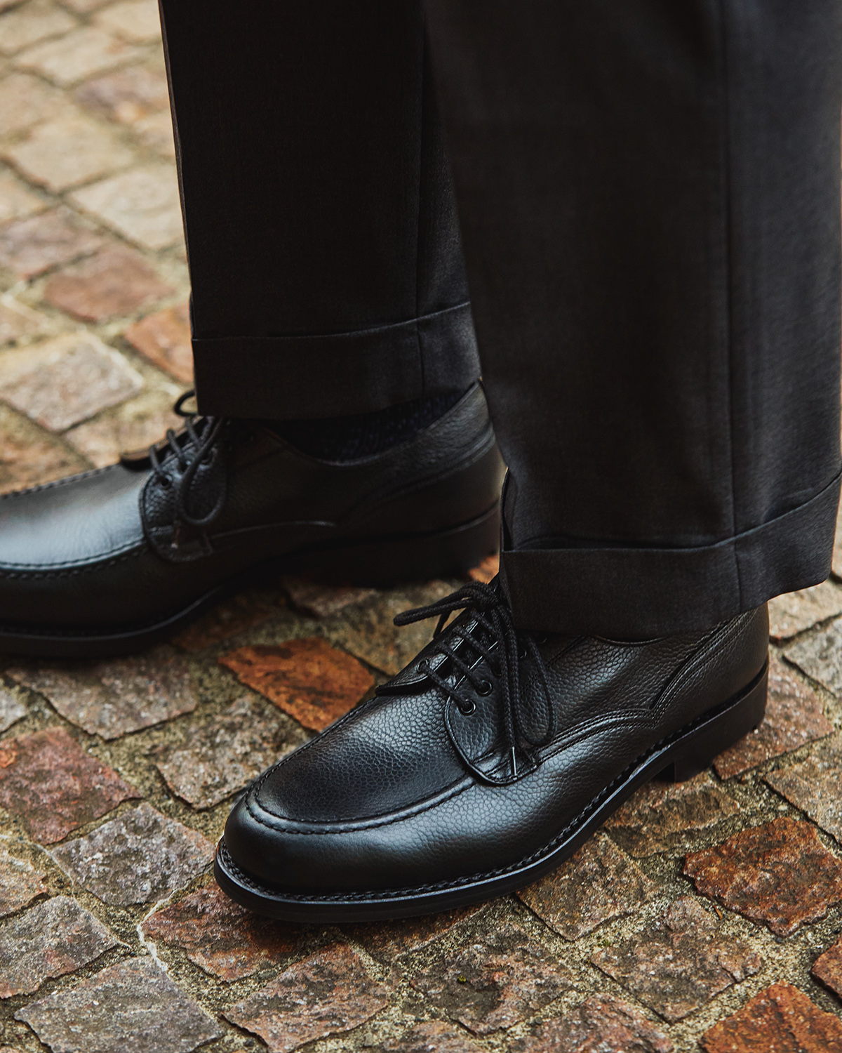 また、オンのシーンではダブルのスラックスのようなアイテムにも適したアイテムです。細いままのシューレースではフォーマル靴の仕様に寄ってしまうため、あえて太めに設定し、トゥの丸みとシボ感を活かして、ビジネスカジュアルや、セミフォーマルなどでも使用しやすい仕様に。